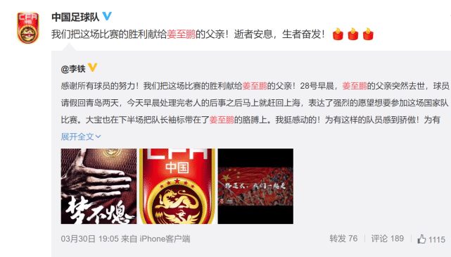 原来,在3月28日姜至鹏收到了噩耗,他的父亲突然去世。在办完父亲后事之后,姜至鹏请假两天就从青岛马上赶回国家队。并且,他还有强烈的比赛愿望,在替补于大宝登场之后被戴上了队长袖标。李铁表示自己十分感动,对于拥有这样的国脚感到骄傲,有这样的团队而感到自豪。随后,中国男足官方转发了李铁的内容,并且表示:“我们把这场比赛的胜利献给姜至鹏的父亲!逝者安息,生者奋发”。很快,姜至鹏所属的俱乐部深圳佳兆业也发文,对他进行诚挚慰问及通报表扬。特别是对于,姜至鹏在处理完家事后第一时间回归国家队,并积极表达了为国出战的愿望,以此来告慰父亲的期许。深圳佳兆业认为姜至鹏,表现了强烈的团队精神和集体荣誉感。