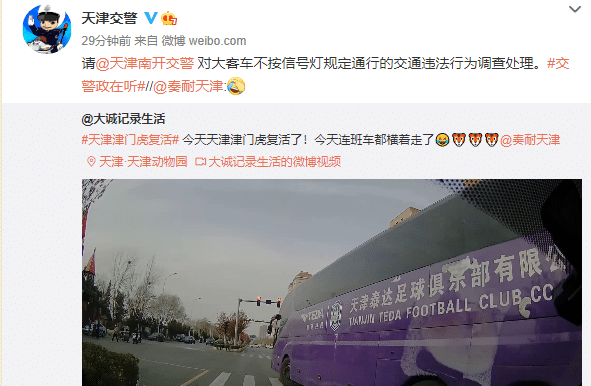这样天津的交警在线上直接就收到和处理了天津津门虎大巴车违反交通规则的事情,也被球迷们调侃是让原本就不富裕的俱乐部,又添加了一笔债务。还有球迷称这是天津津门虎的大巴车司机高兴的,他终于不用下岗了,所以才嗨过头了。