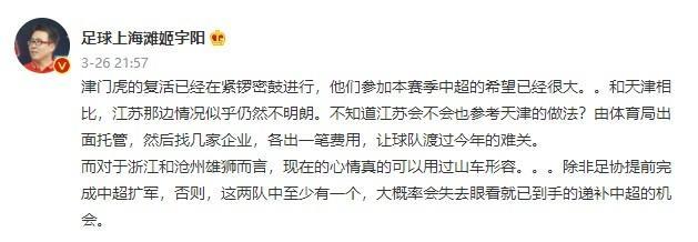 姬宇阳写道:“津门虎的复活已经在紧锣密鼓进行,他们参加本赛季中超的希望已经很大。。和天津相比,江苏那边情况似乎仍然不明朗。不知道江苏会不会也参考天津的做法?由体育局出面托管,然后找几家企业,各出一笔费用,让球队渡过今年的难关。”