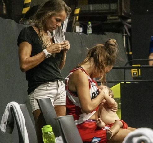 可是当听到孩子肚子饿的哭声,安东内拉瞬间又回归了母亲的身份,她向教练申请了“暂停”,来到场边哺育自己的孩子,在孩子吃饱后,安东内拉迅速整理了自己的衣着,迅速上场比赛。
