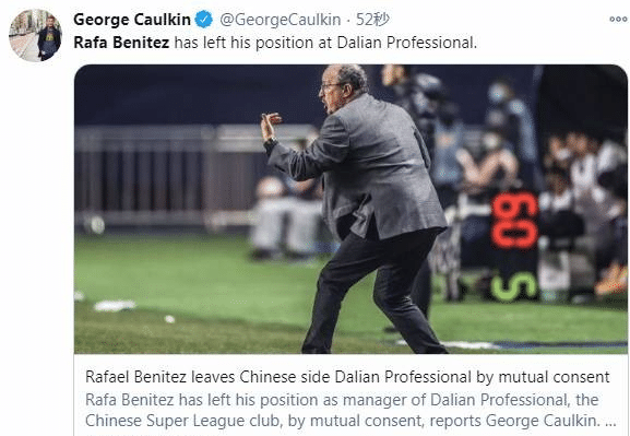 24直播网1月23日讯 今天晚上,中超频频传来重磅消息,除了有沙拉维和申花解约之外,现在传来的消息,贝尼特斯与大连人解约,消息源是权威媒体Athletic。此前大连人开启冬训,贝尼特斯并没有给归队,据悉他远程安排了球队近期的训练课。