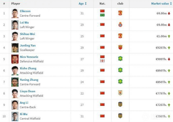 北京时间1月9日,权威转会网站“德转”公布了最新一期的身价榜,国足最贵的10人也已经诞生了,由中超2大金靴领衔,分别是艾克森和武磊,按照已身披过国字号战袍的国脚来统计,艾克森和武磊是现役身价最高的球员,两人都是400万欧元,其中武磊出现了近期4连降的局面,从2020年初的1000万欧元降至现在的400万欧元,蒸发了600万,不过武磊的身价在西乙也是大腿级别,位列全队第6名,全西乙第10名。