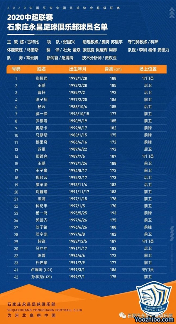 门将:1-张振强、14-邵镤亮、29-韩锋、41-卢瀚涛(U23)
