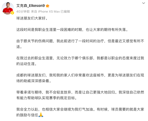 而艾克森本人也在社交媒体上发文,亲承自己之所以连续伤缺数轮联赛,是因为膝盖有伤。艾克森失望写道:“这段时间是我职业生涯里一段困难的时期,也让大家的期待有所失落。我遇到了膝盖伤病问题,此前进行了一段时间的治疗,但最近又感觉有所不适。”