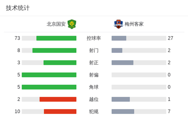 全场比赛结束,北京国安3-2梅州客家。