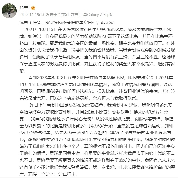 24直播网讯 北京时间9月11日晚,26岁的黑龙江冰城门将芦宁,写下长文对自己被足协禁赛5年的处罚进行回应。芦宁否认自己踢假球的同时,还直言会通过正规法律武器,来维护自己的尊严。