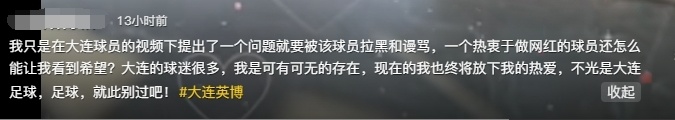 得到这样的回复之后,这位大连球迷气得发文告别足球:“我只是在大连球员的视频下提出了一个问题就要被该球员拉黑和谩骂,一个热衷于做网红的球员还怎么能让我看到希望?大连的球迷很多,我是可有可无的存在,现在的我也终将放下我的热爱,不光是大连足球,足球,就此别过吧!”