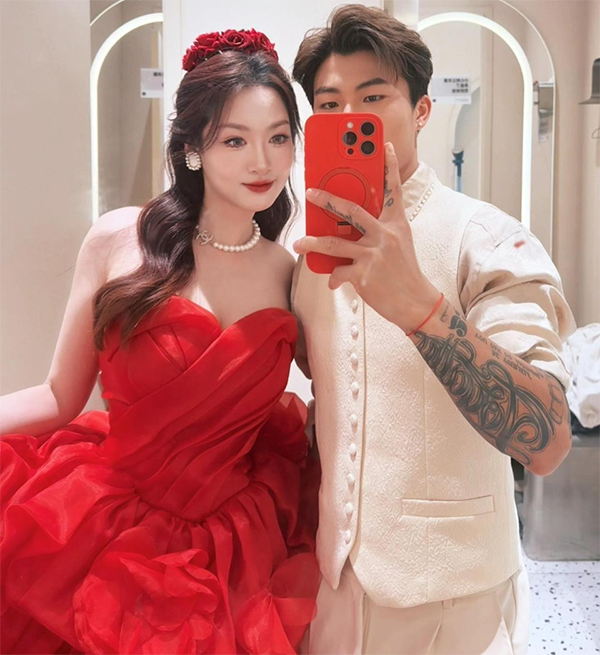 在晒出的照片里,小两口显得十分恩爱,谢文能身穿白色西装马甲挺拔帅气,他还秀出自己手臂上霸气的纹身。而妻子则盛装打扮,一袭红裙惊艳亮相,头上戴着鲜艳的玫瑰花,并且有璀璨的钻石耳环和珍珠项链点缀,显得光彩照人。