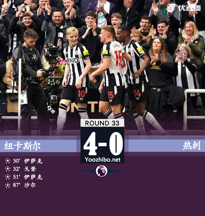 24直播网讯:北京时间4月13日在英超联赛第33轮的比赛中,纽卡斯尔联队在主场迎战托特纳姆热刺队。伊萨克在比赛中攻入两球,安东尼-戈登和法比安-舍尔也各自有进球。最终比分是纽卡斯尔联 4-0 托特纳姆热刺。