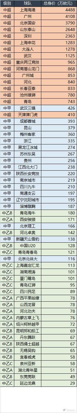 24直播网讯 根据德转朱艺统计,上海海港以4488万欧元位列中国前三级联赛身价榜头名,广州和北京则分列二三位。