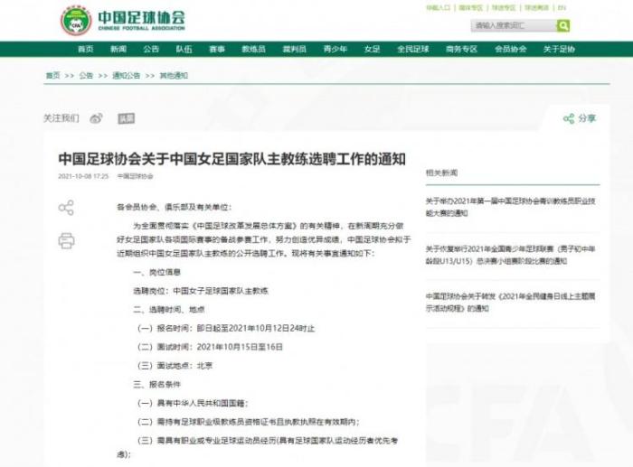24直播网讯 10月8日消息,中国足协官网发布女足国家队主帅招聘信息,应聘者需持有中国国籍,面试时间为本月15日至16日。