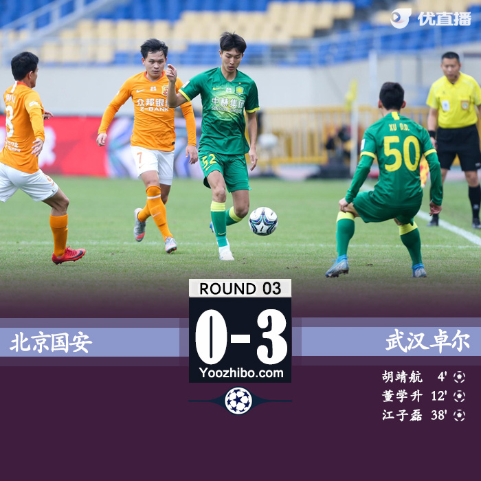 24直播网讯:北京时间12月2日下午,2020中国足协杯1/4决赛继续进行,武汉卓尔3-0战胜年轻球员出战的北京中赫国安,卓尔晋级足协杯四强。开局阶段国安门将与后卫接连犯错,胡靖航与董学升均通过禁区内抢断攻破空门;第38分钟,卓尔抢断快攻,江子磊接胡靖航传球包抄破门。