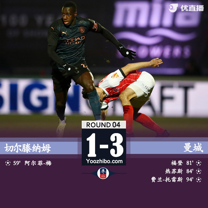 全场比赛结束,切尔滕纳姆1-3曼城。