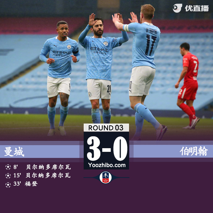 24直播网讯:北京时间1月10日21:30,足总杯第三轮比赛,曼城对阵伯明翰。上半场,B席开场不久就凌空抽射破门,随后接德布劳内助攻再下一城,热苏斯造险,福登贴地斩建功;下半场,热苏斯禁区内倒地但裁判没有表示,马赫雷斯破门但越位无效,曼城3-0伯明翰晋级足总杯第四轮。